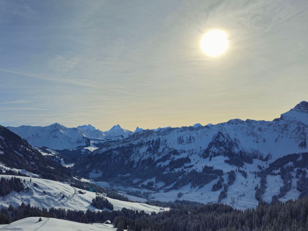 Das Bild fängt nicht nur eine Landschaft ein, sondern auch einen Moment der Stille und des Staunens. Es erinnert daran, wie klein wir Menschen inmitten dieser gewaltigen Natur sind. Der Sonnenschein, der sich seinen Weg über die Berggipfel bahnt, lässt die Kälte des Winters fast vergessen – ein perfektes Beispiel für die Magie der Natur.